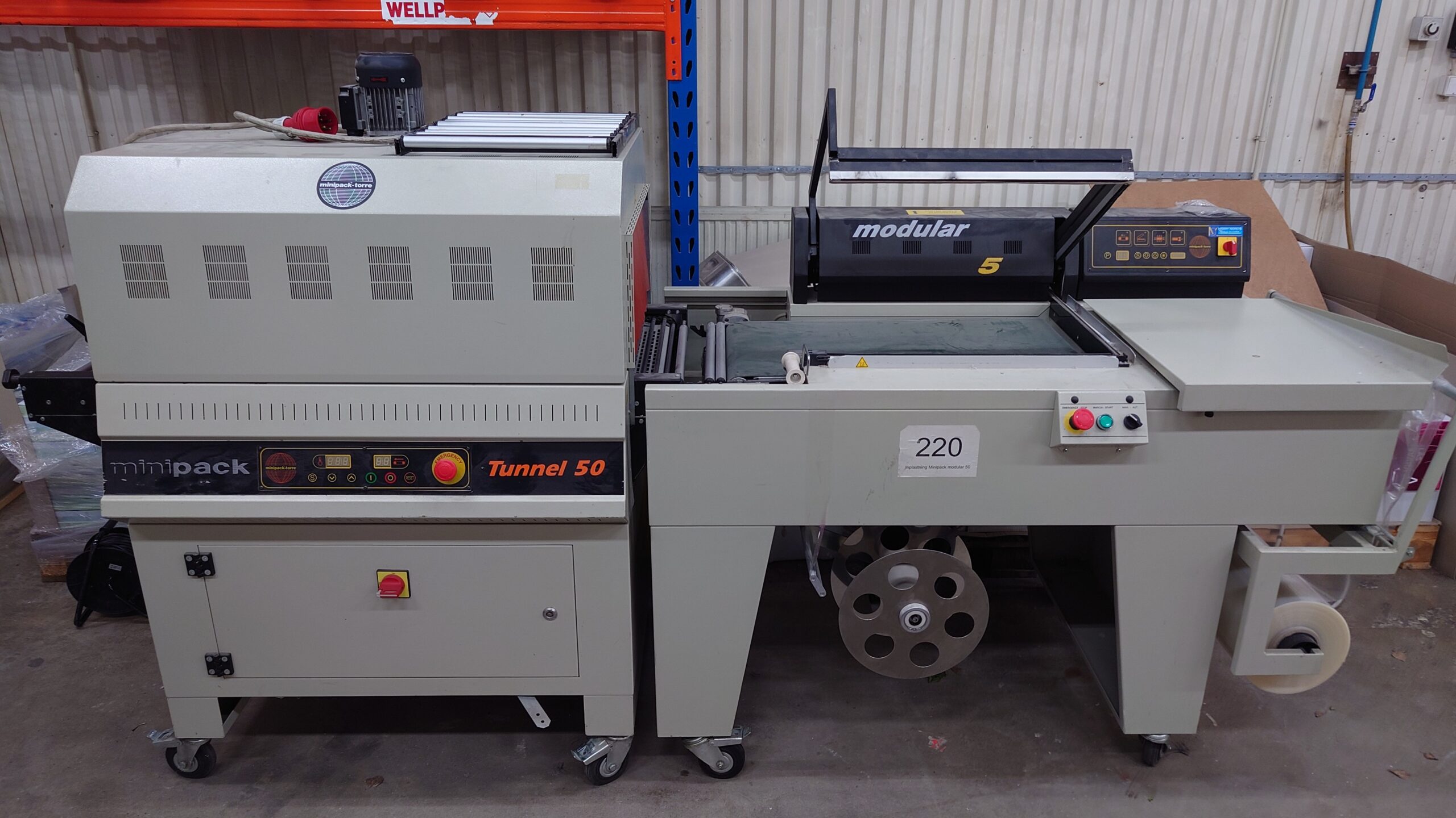 Minipack Tunnel 50 krymptunnel för inplastning av trycksaker, produkter mm. Komplett med vinkelsvets och värmetunnel samt ett avläggarbord. Max 400 x 220 x L på produkten som skall plastas in.