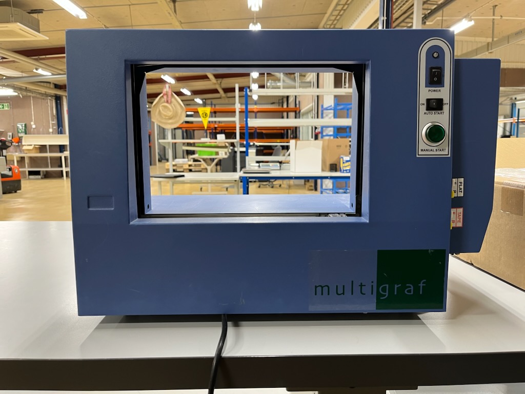 Multigraf BM-300A banderolleringsmaskin för papper eller plastbanderoller. Bandbredd: 30 mm. 15-18 banderoller per minut. Max mått: 300 x 200 mm. Justerbart bandtryck i tre nivåer.