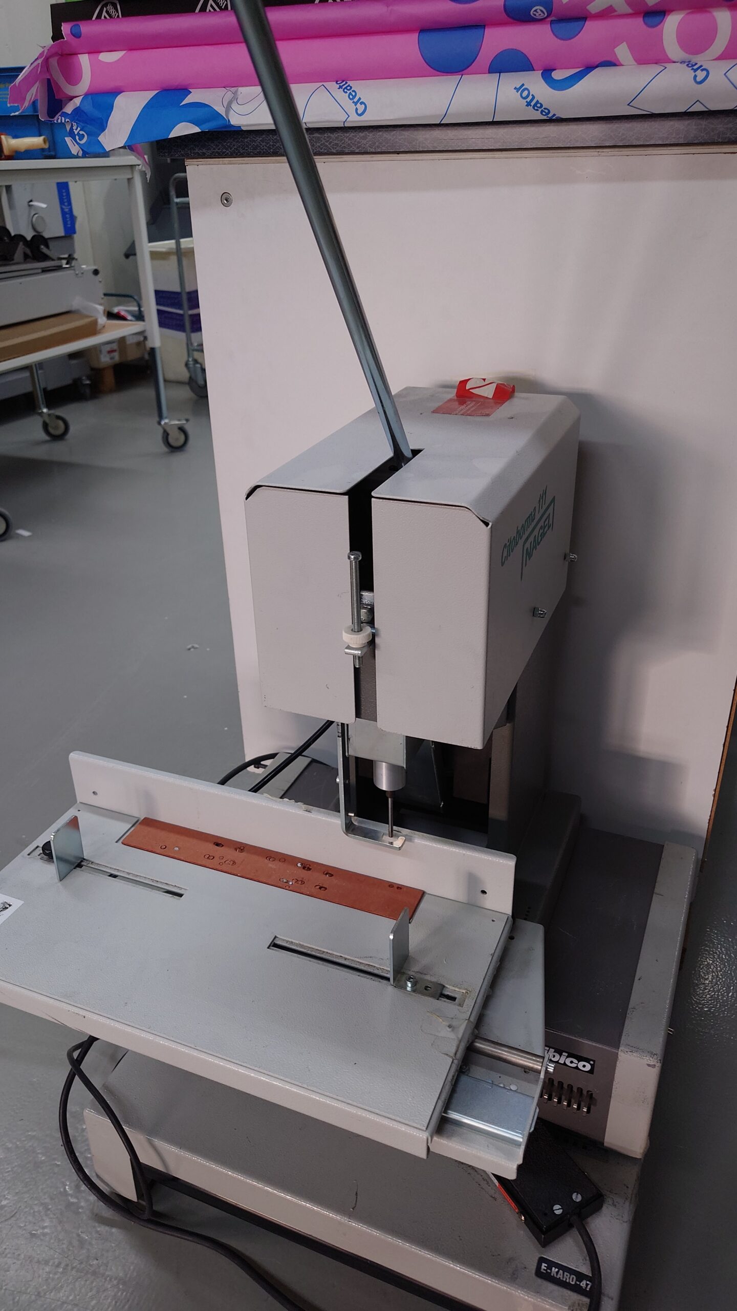 Nagel CB 111 enspindlig pappersborrmaskin. Tar ca 5 cm tjocka pappersbuntar.