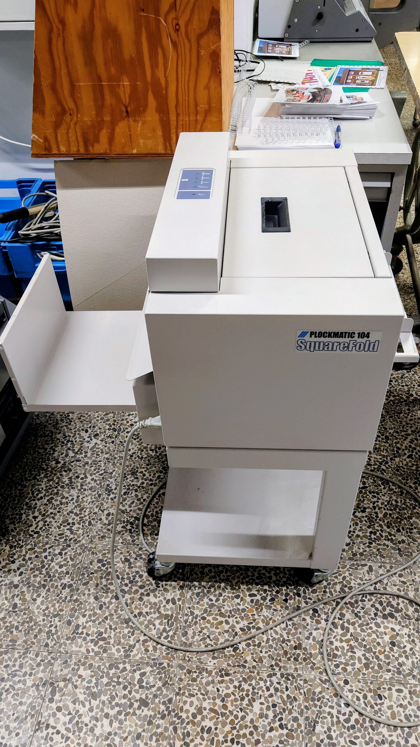 PL 104 fyrkantsryggmaskin med stativ. Går att sätta online med printer eller arbeta offline.